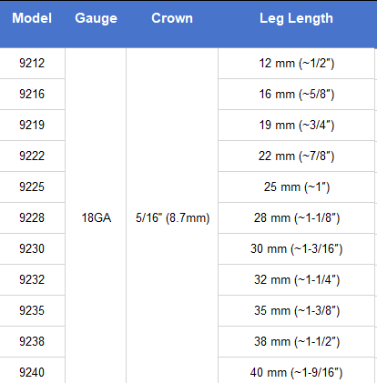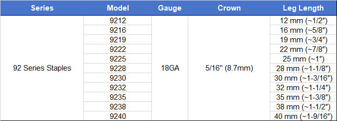 Detailed Information For 5/16" Crown 92 Series Staples